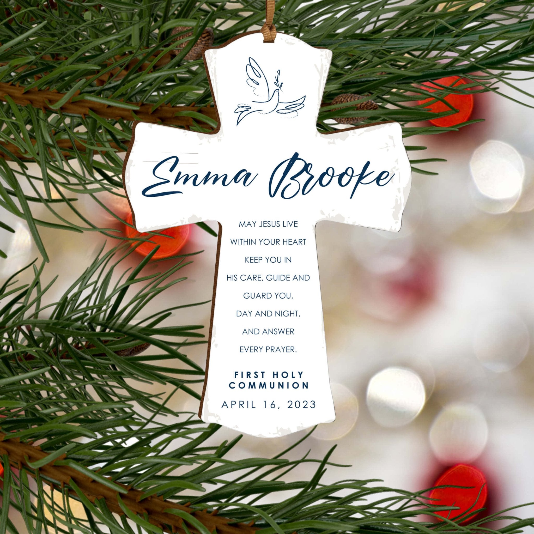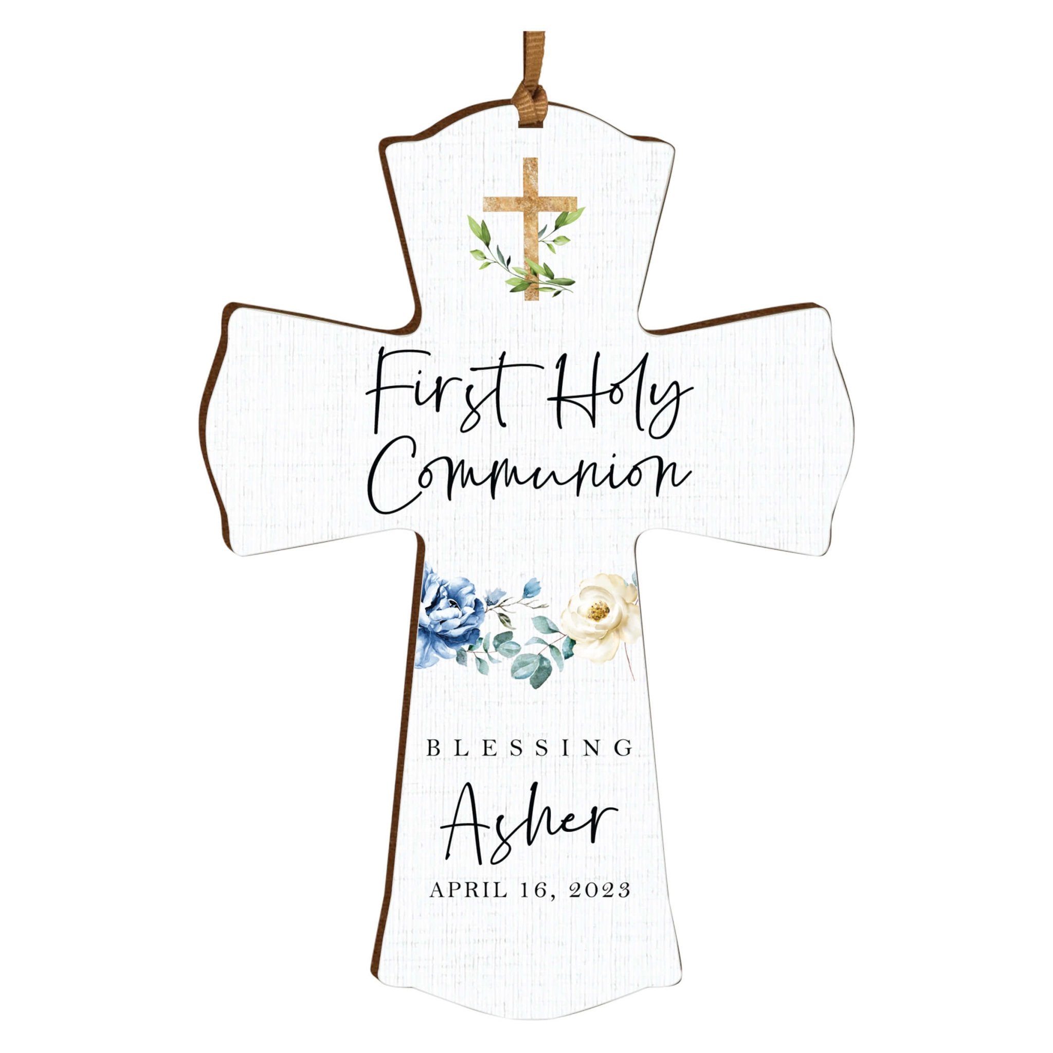 Celebrate a momentous occasion with the Lifesong Milestones Personalized First Holy Communion Wooden Hanging Mini Cross. This beautifully crafted wooden cross is designed specifically for First Holy Communion and makes for a memorable gift. The cross features digitally printed designs, adding a touch of uniqueness and personalization. Ideal for both baby girls and boys, this mini cross serves as a cherished keepsake to commemorate their special day. It symbolizes faith, love, and devotion, making it a meaningful addition to any nursery or room decor.