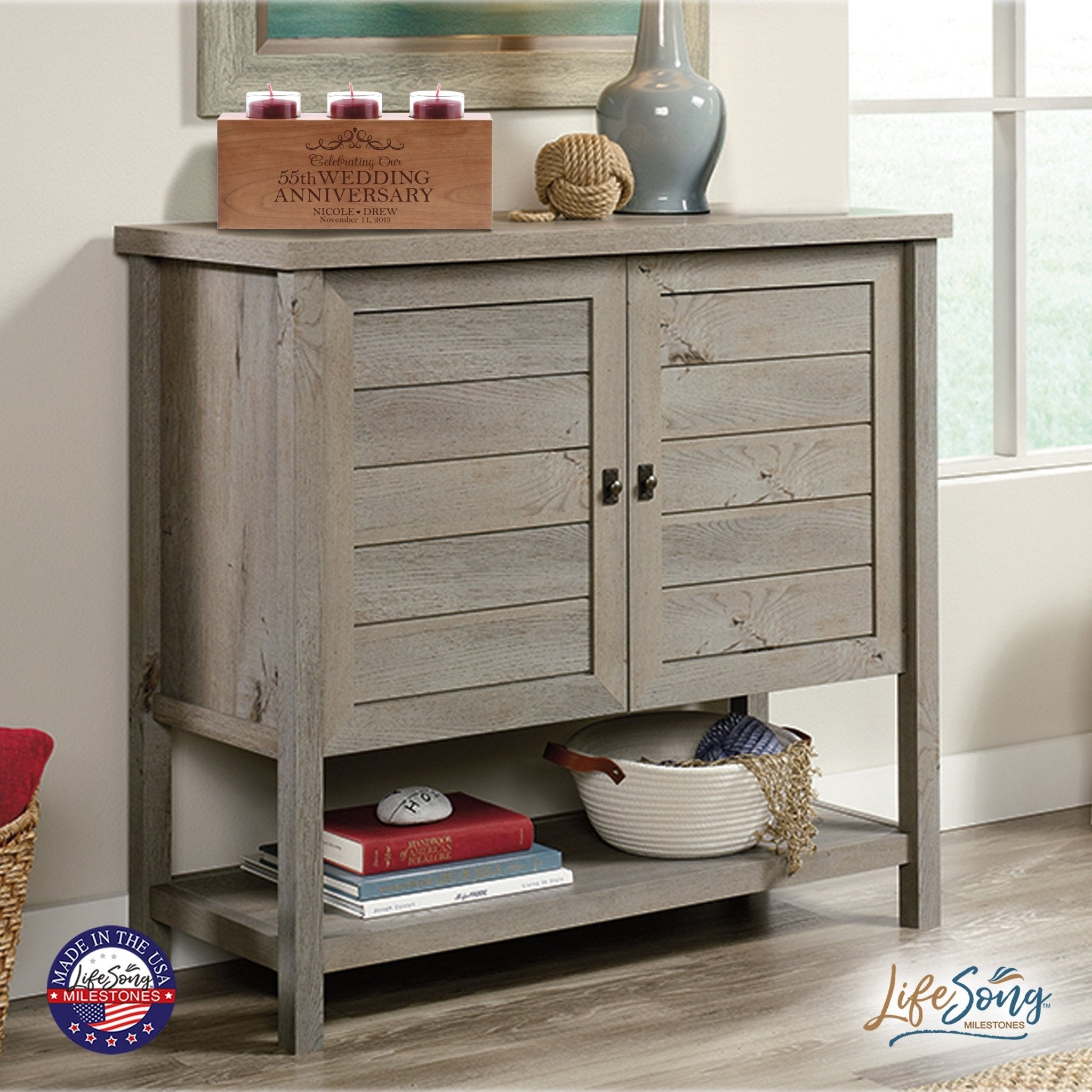 Crafted for both elegance and durability, this custom candle holder seamlessly integrates into your anniversary celebration. The radiant, emerald glow it emits not only brightens your space but also symbolizes the enduring flame of love that has thrived over the years. Embrace the profound significance of your fifty-fifth anniversary with the timeless beauty of the LifeSong Milestones 55th Anniversary Candle Holder.