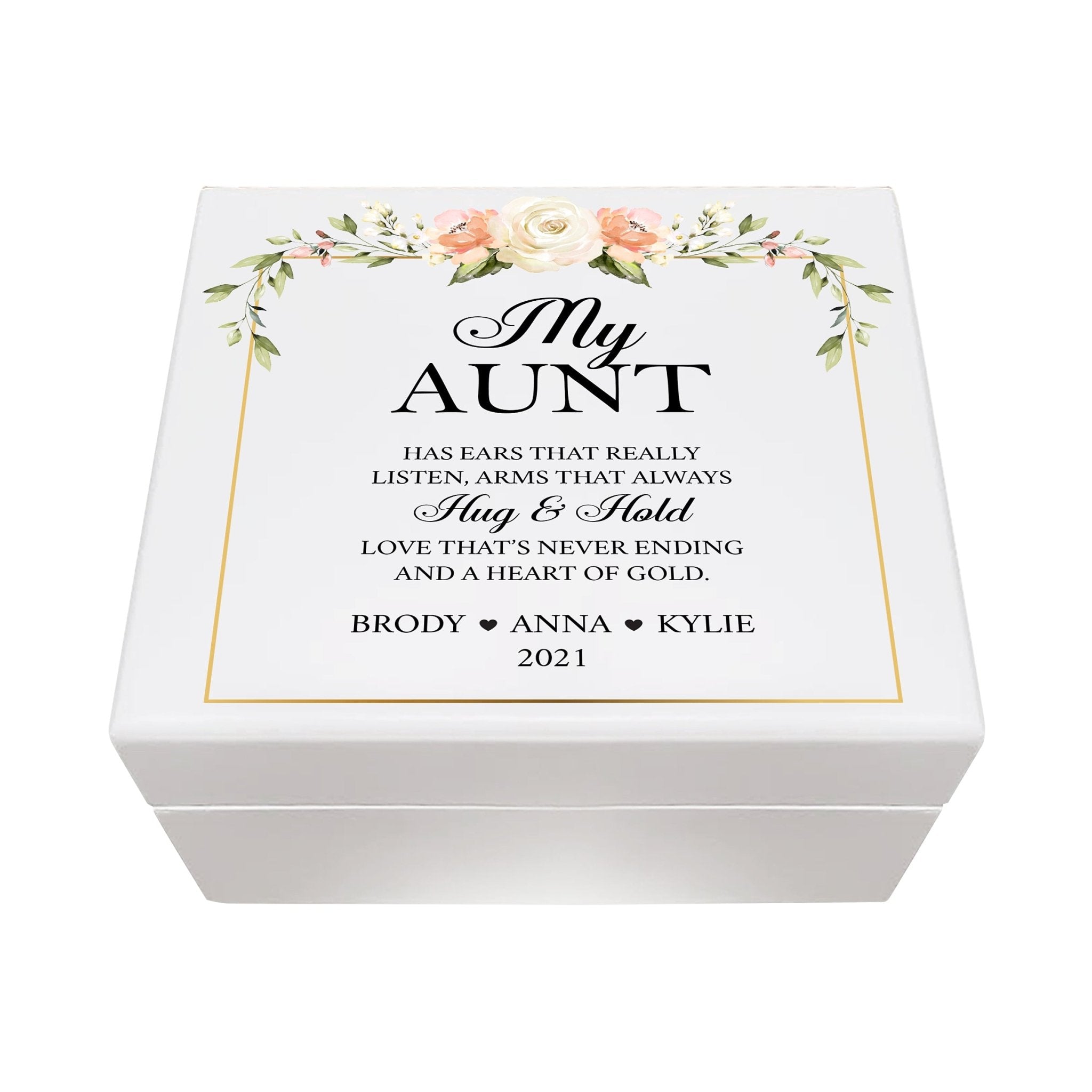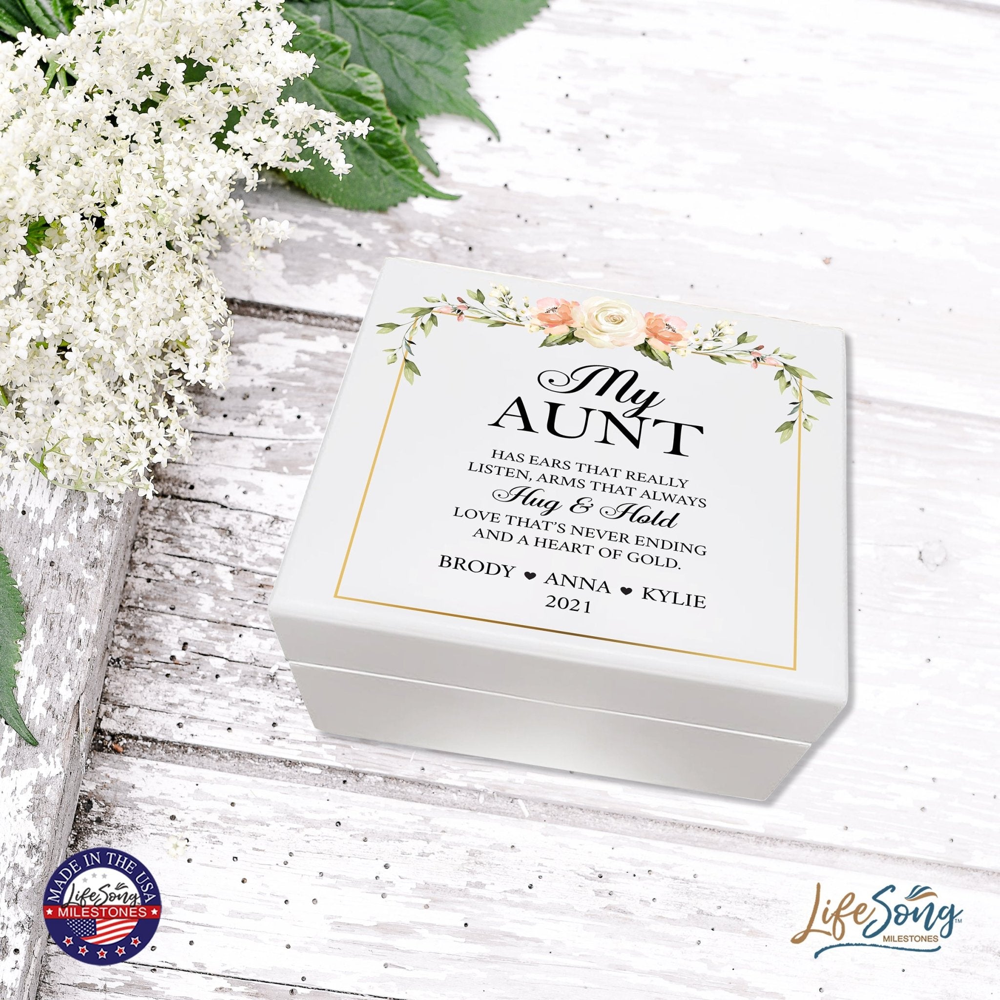 LifeSong Milestones Personalized Memorable Aunt’s White Keepsake Box Details:
