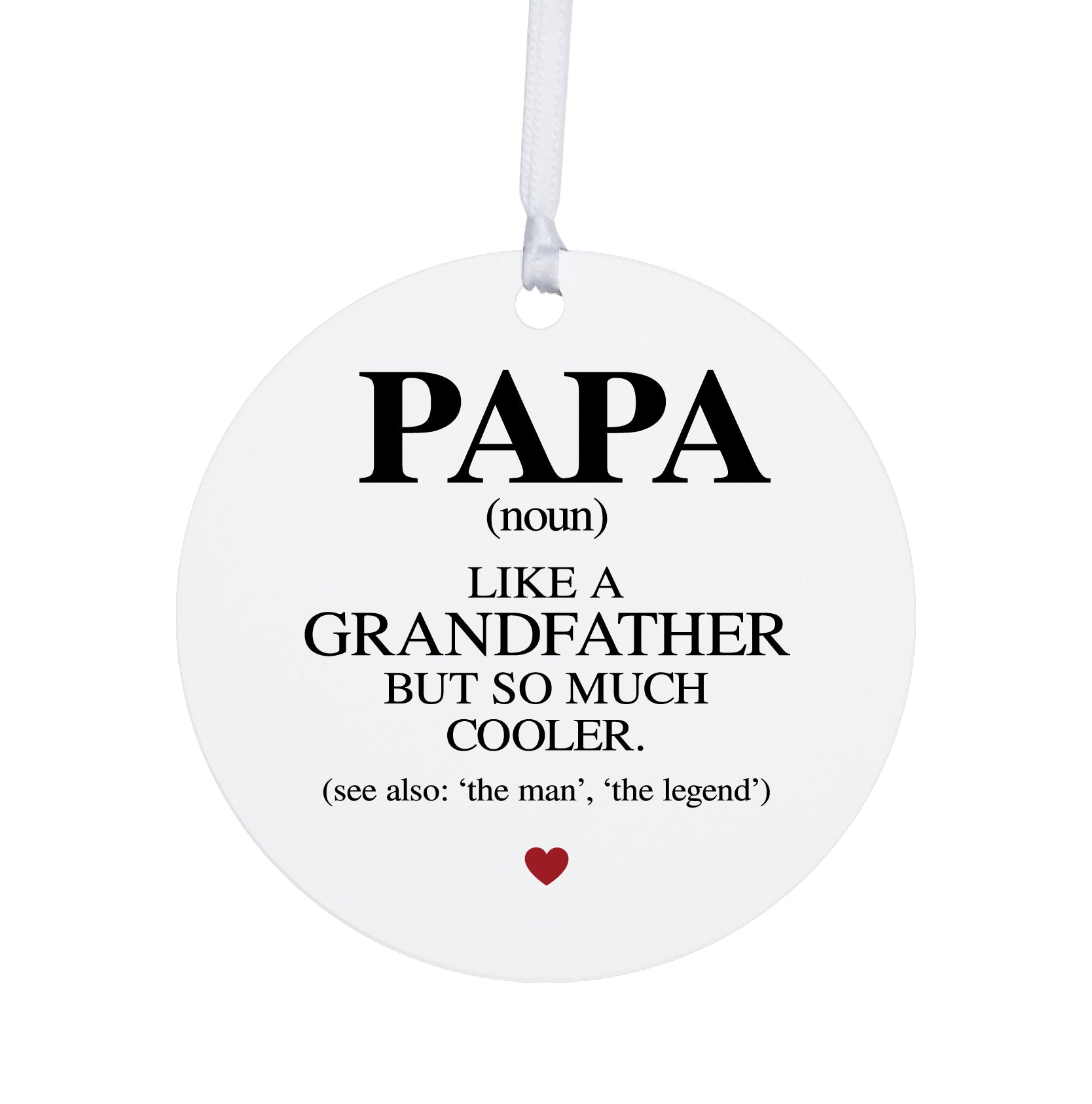 Introducing the Grandparents White Ornament With Inspirational Message Gift Ideas - Papa (n.) Like A Grandfather! This stunning home decor piece is a must-have for anyone seeking meaningful ornaments and sentimental gifts. The digitally printed verse, "Papa (n.) Like a Grandfather but so much cooler," adds a touch of warmth and humor to your home decorations.