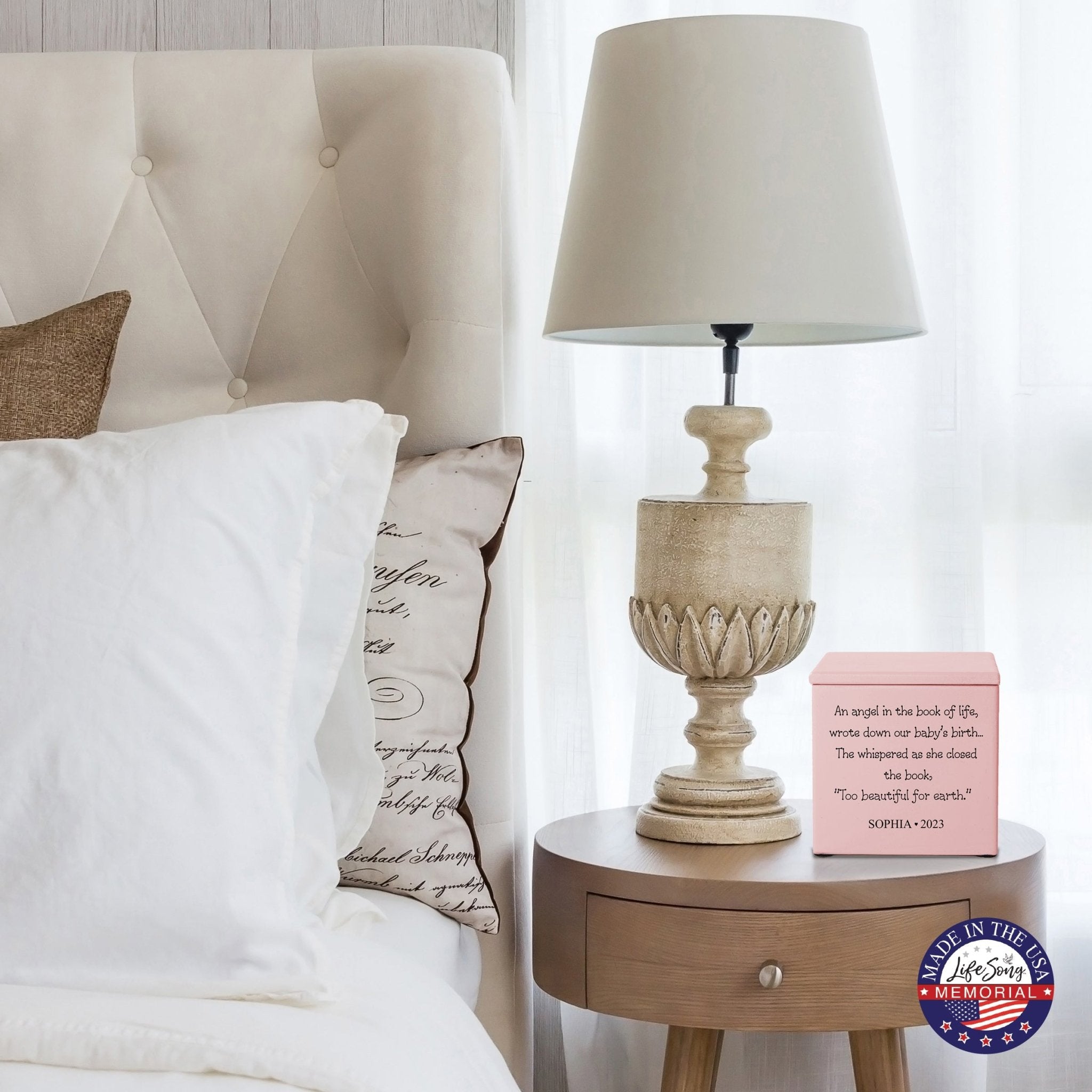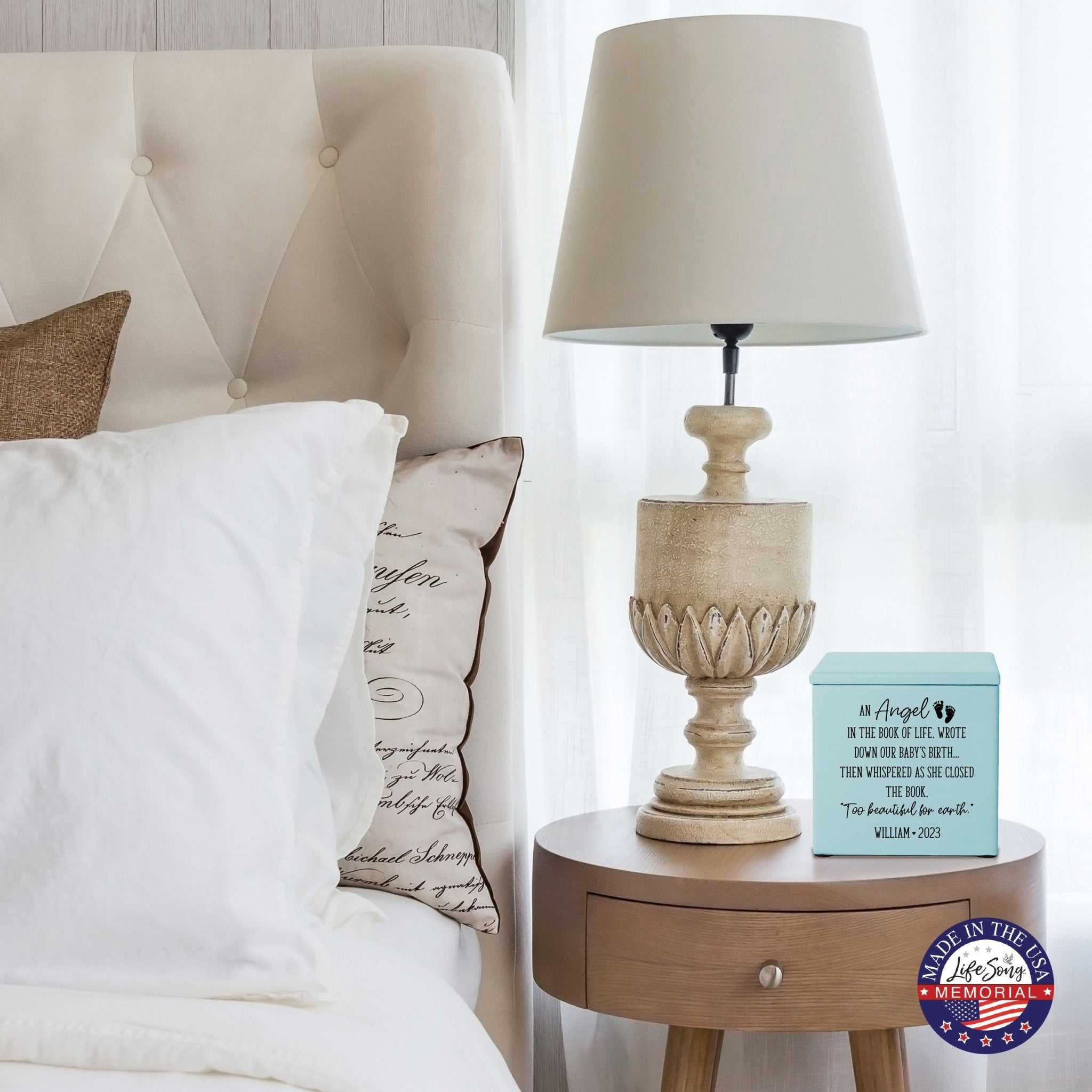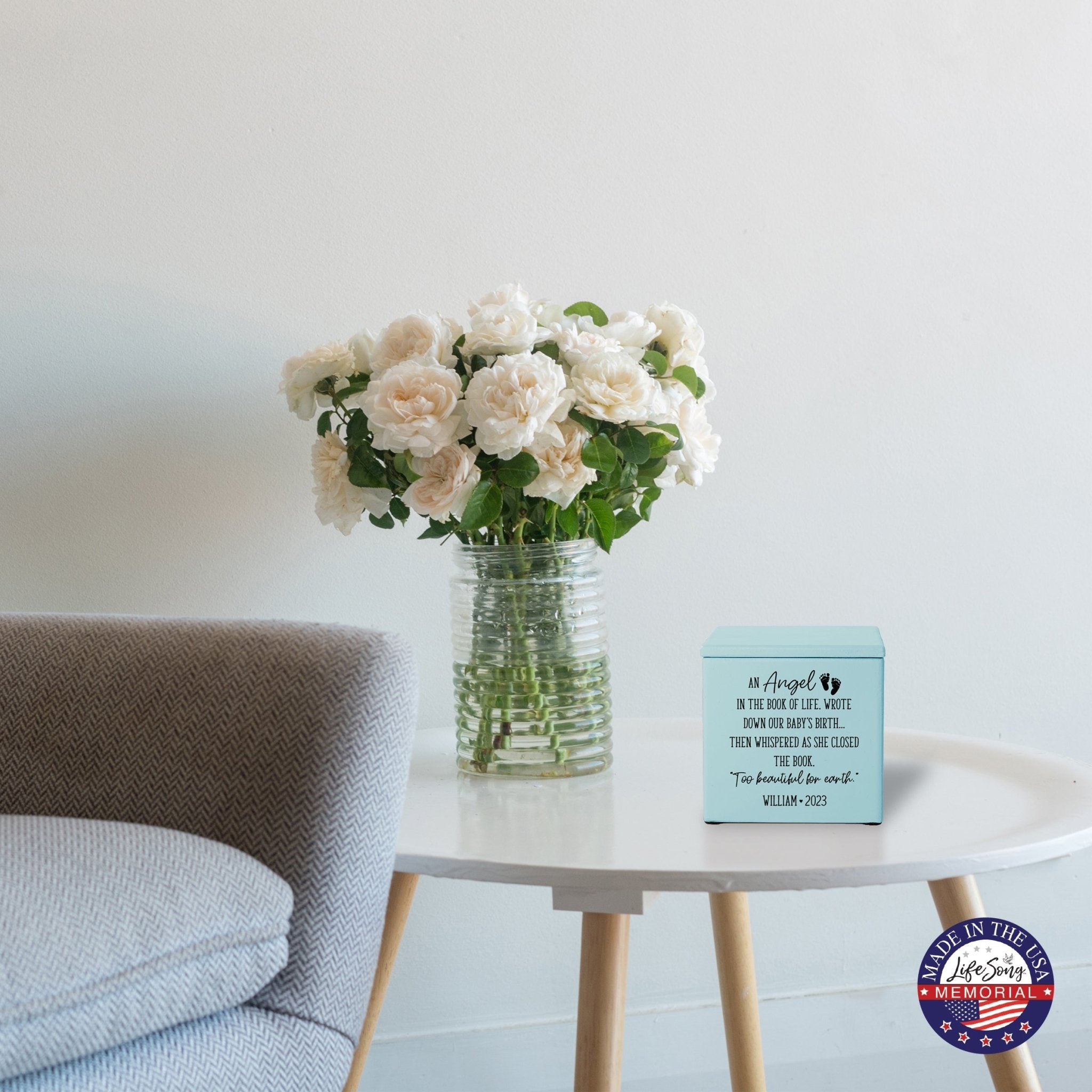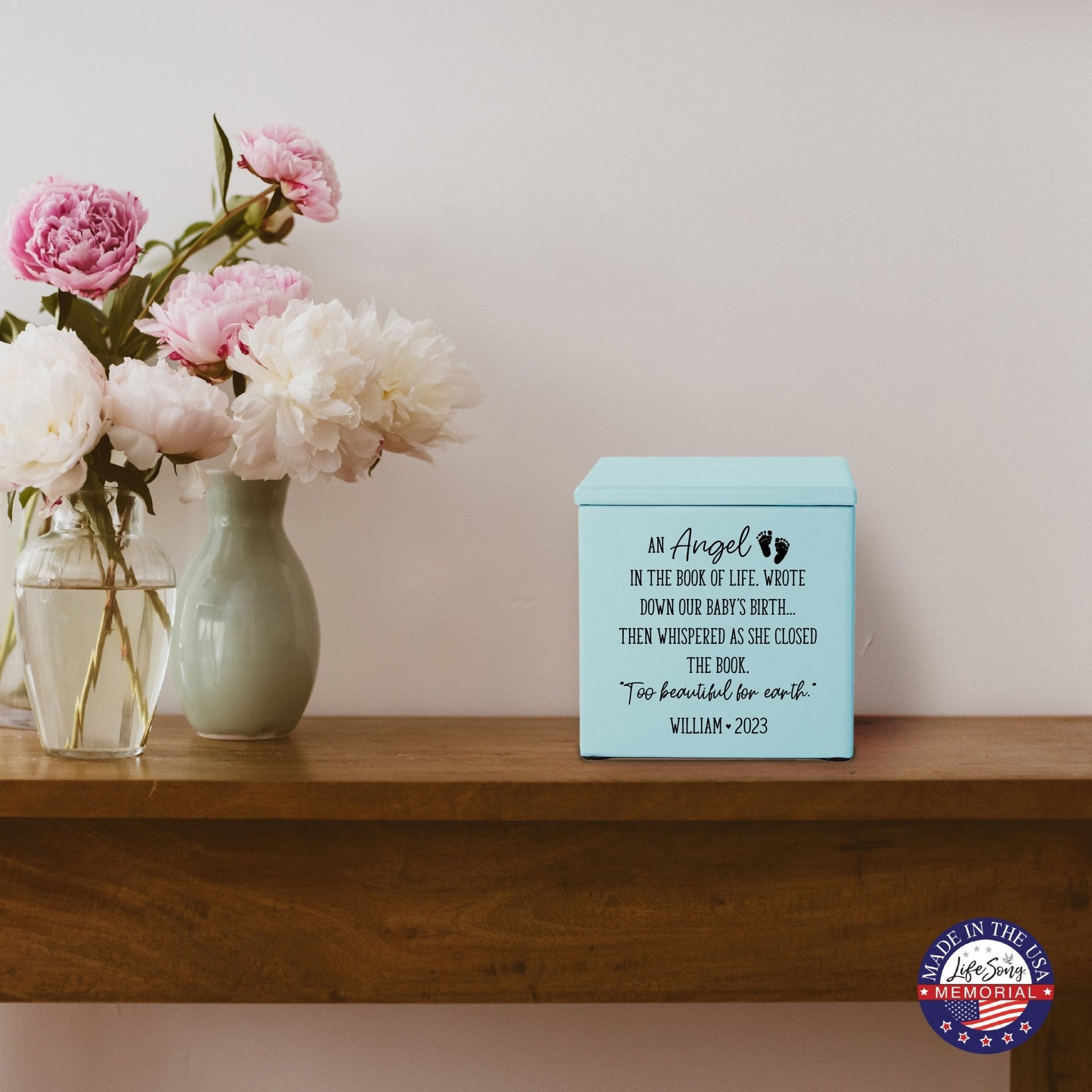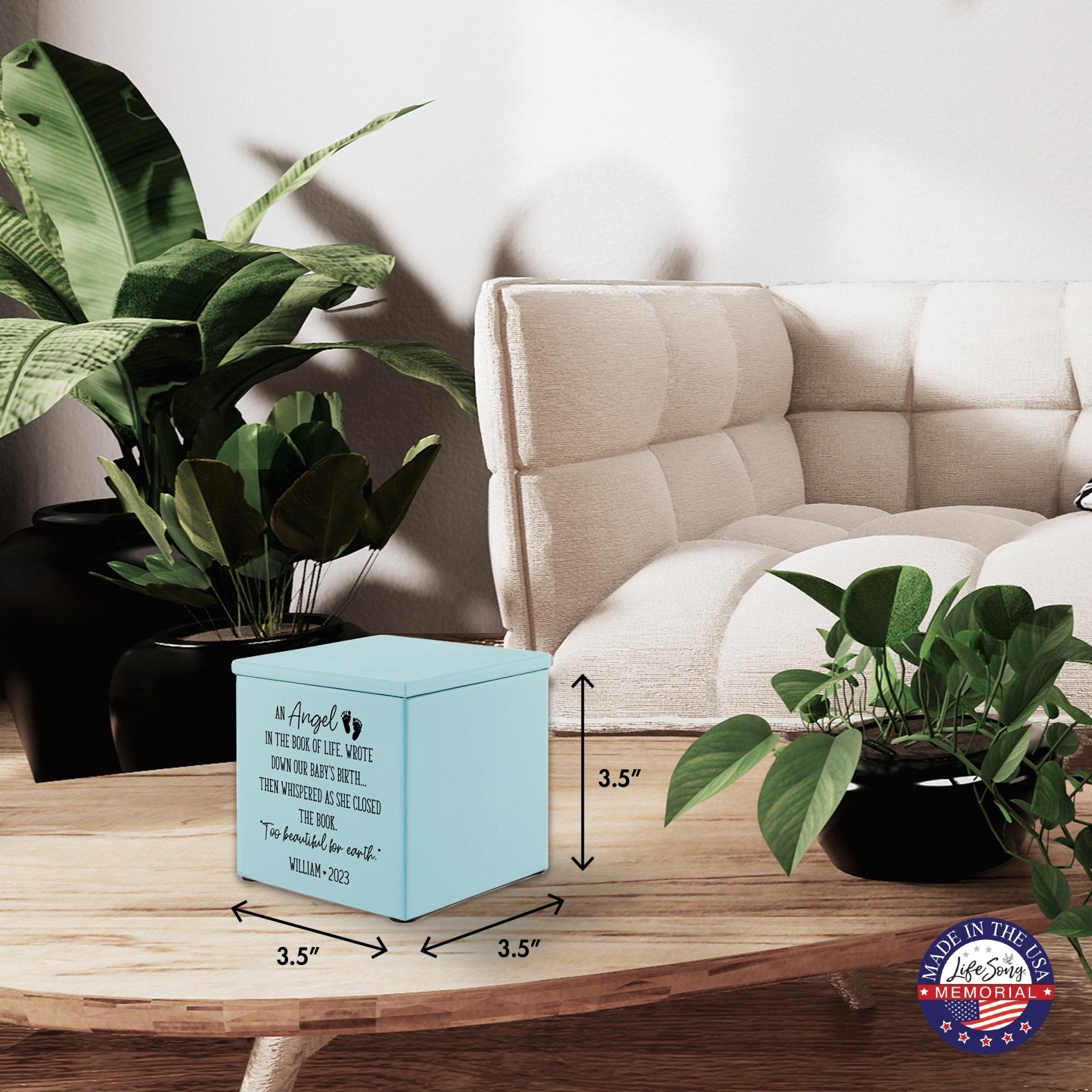 Lifesong Milestones Cremation Urns presents a beautiful way to honor and cherish your loved ones with the Personalized Still Born Infant Wooden Memorial Keepsake Urn for Human Ashes. This urn is made with Maple Wood (Black and ivory), Cherry Wood (Others), and is handcrafted and laser-engraved to perfection. The urn size calculator ensures that it holds approximately 17 cubic inches of ashes, equivalent to a baby's weight before cremation.