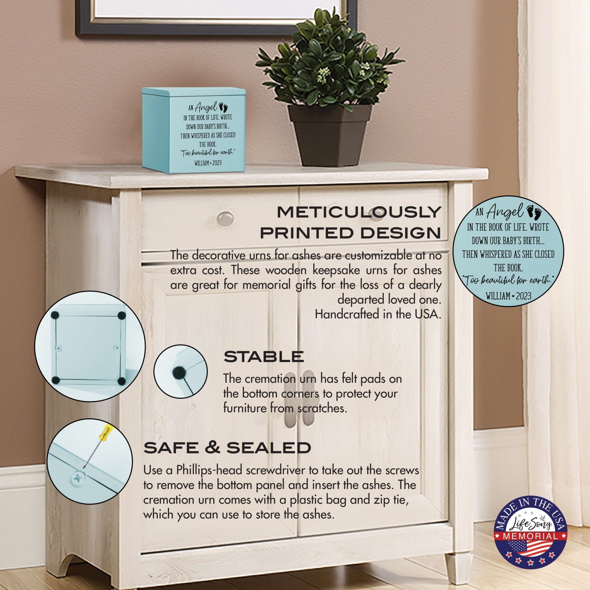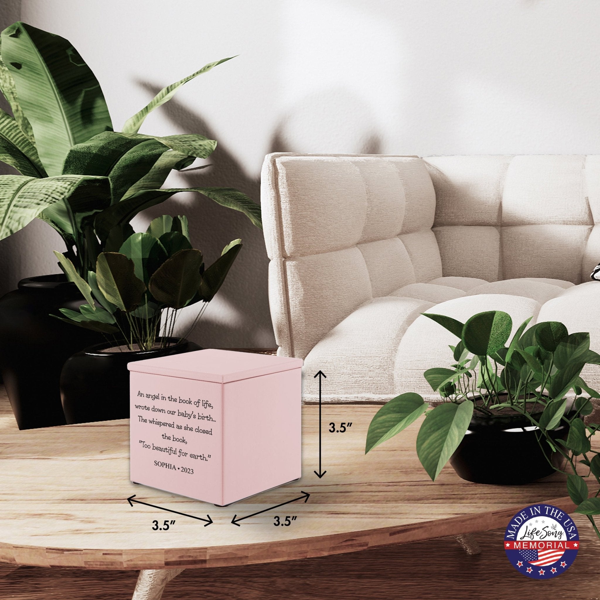 The urn is compact, with dimensions of 3.5" (W) 3.5” (H) x 3.5" (T) inches, which makes it perfect for keeping at home or carrying with you wherever you go. The product weight of 8.5 oz. makes it easy to handle, while the cremation bag is included free of charge. The order is processed within 3-4 days, and Phillips Head Screwdrivers are needed to take out the screws to insert the ashes. With this personalized stillborn infant wooden memorial keepsake urn, your loved one's memory will be cherished forever.