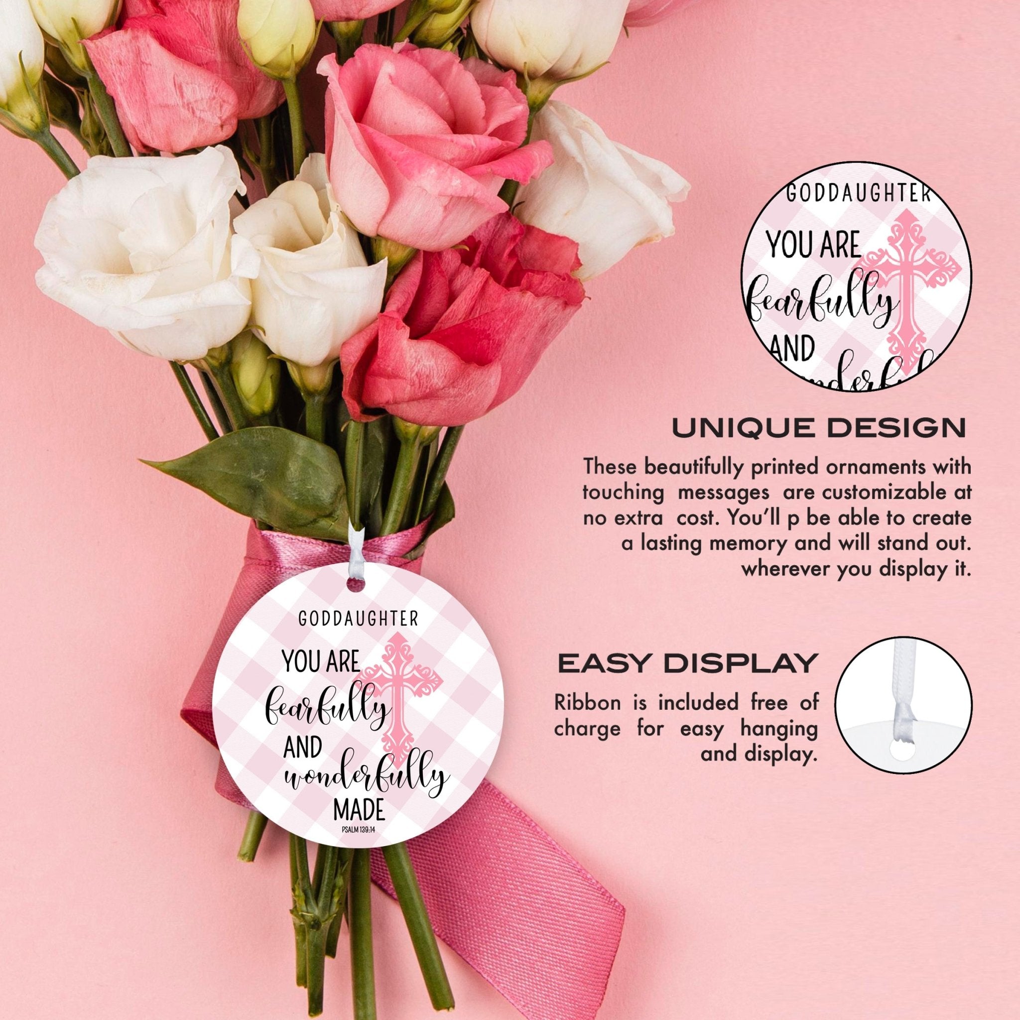 Introducing our exquisitely crafted Wooden Baptism Hanging Ornament Gift for Goddaughter, a timeless keepsake symbolizing faith and love. Each ornament is meticulously designed with intricate details, making it a cherished addition to any home decor. Delicately engraved with heartfelt sentiments, it serves as a touching reminder of her spiritual journey. Included is a complimentary ribbon for effortless hanging and display, ensuring it takes pride of place in her room or nursery. Ideal for baptisms, christenings, first communions, dedications, or any special occasion. Don't miss the opportunity to gift her something truly unique and meaningful. Add to cart now and celebrate her milestone with joy and love.