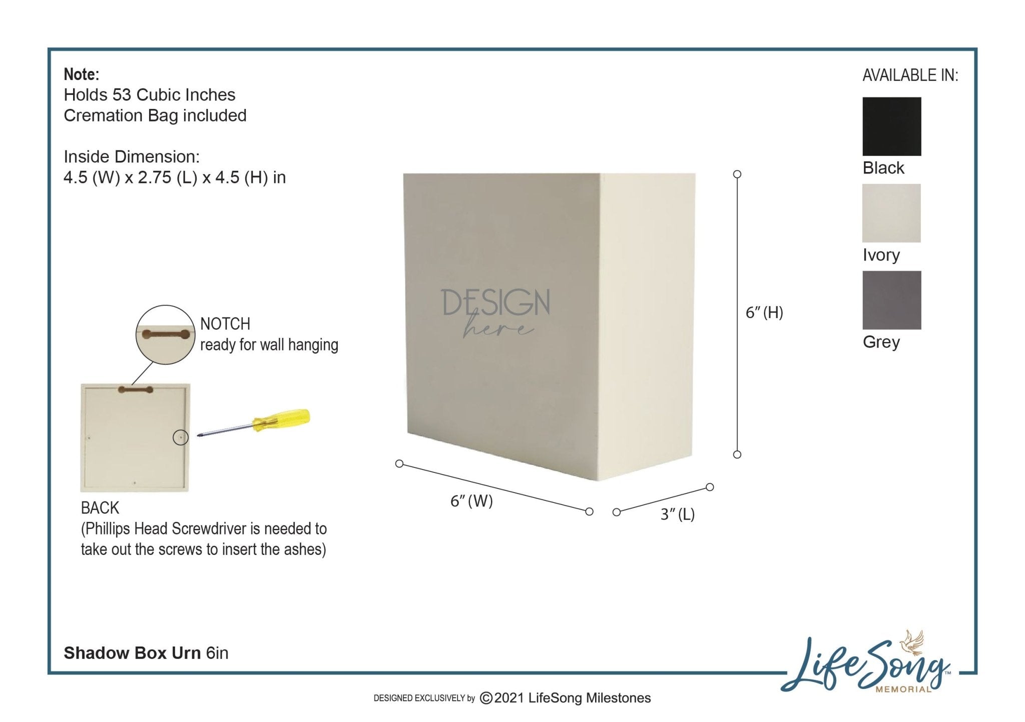| 6x6x3 | 12.5 oz | 53 Cubic Inches of Ashes | |