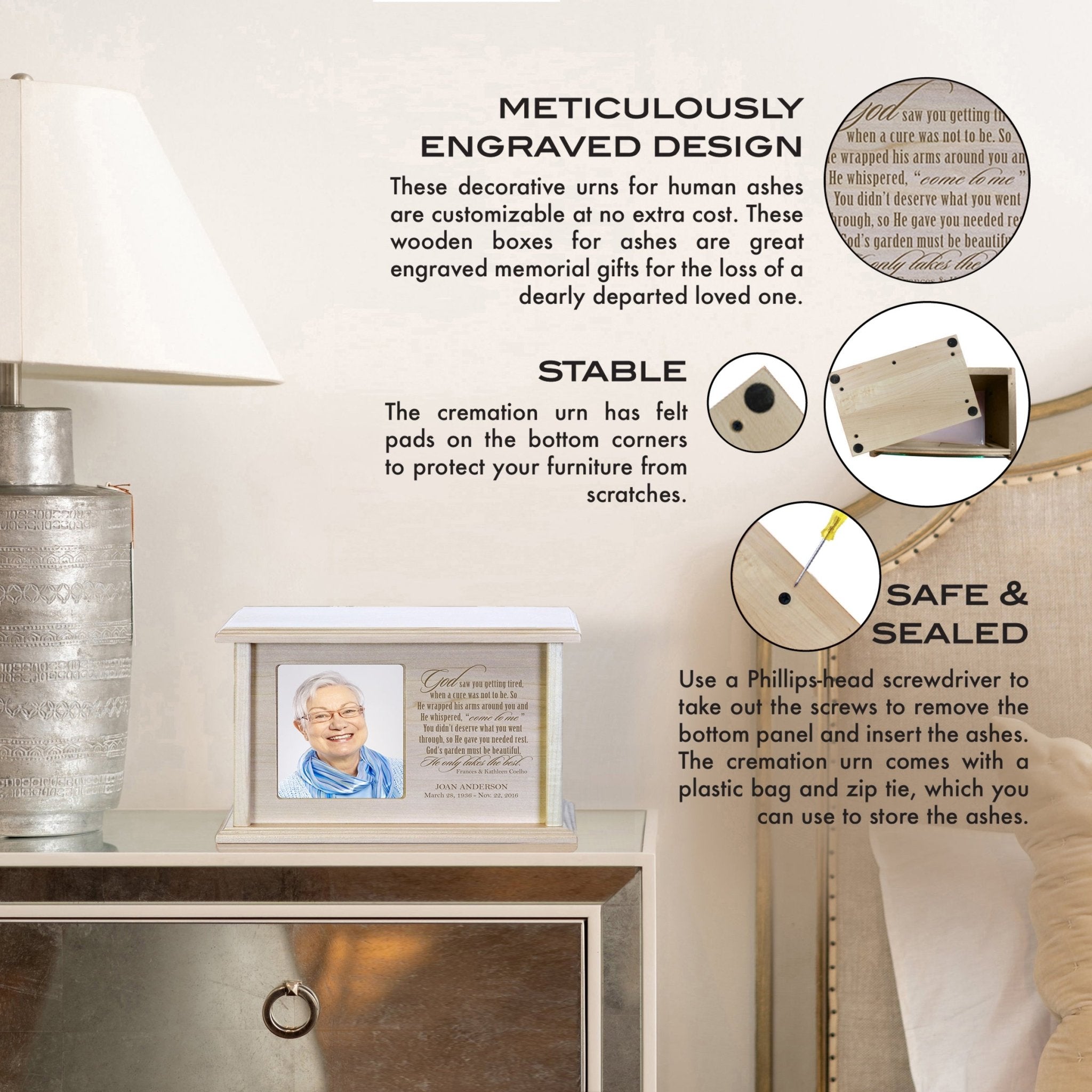 Honor your loved one's memory with our Custom Engraved Memorial Photo Urn for Human Ashes. This elegant wooden urn holds 262 cubic inches of ashes and features a space for a 4x5 photo, adding a personalized touch. Beautifully engraved with intricate designs, it doubles as a decorative piece. Each urn comes with a cremation bag, ensuring your loved one’s ashes are securely kept. Ideal as a sympathy, bereavement, or memorial gift, this custom memorial urn provides a timeless tribute. Choose this photo cremation urn to commemorate a cherished life with a truly pretty urn box that conveys heartfelt sentiments.