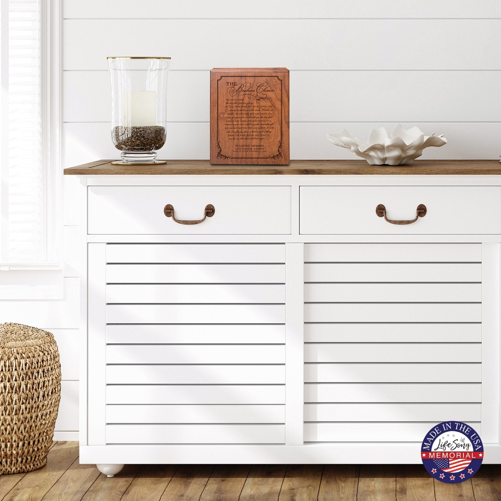 Adorned with a laser-engraved verse that reads, "We little knew the day that God was going to call your name. In life we loved you dearly, in death we do the same. It broke our hearts to lose you but you didn't go alone, for part of us went with you the day God called you home. You left us peaceful memories, your love is still our guide, and although we cannot see you, you are always at our side. Our family chain is broken and nothing seems the same, but as God calls us one by one, the chain will link again", this urn captures the profound love and deep loss experienced during this time of mourning. It serves as a heartfelt reminder of the unbreakable bond we share with those who have passed.
