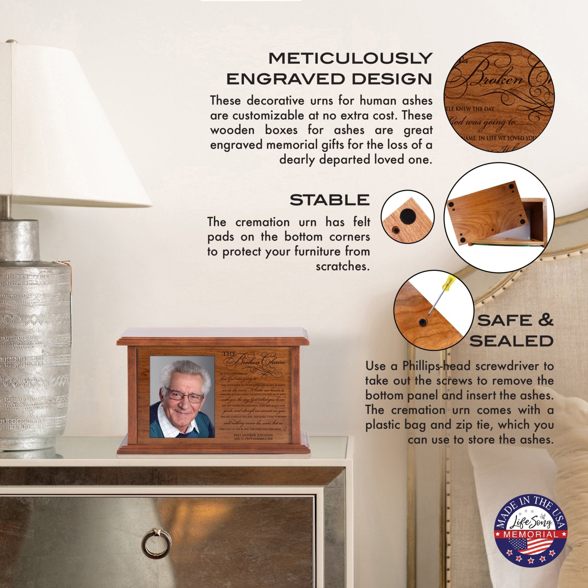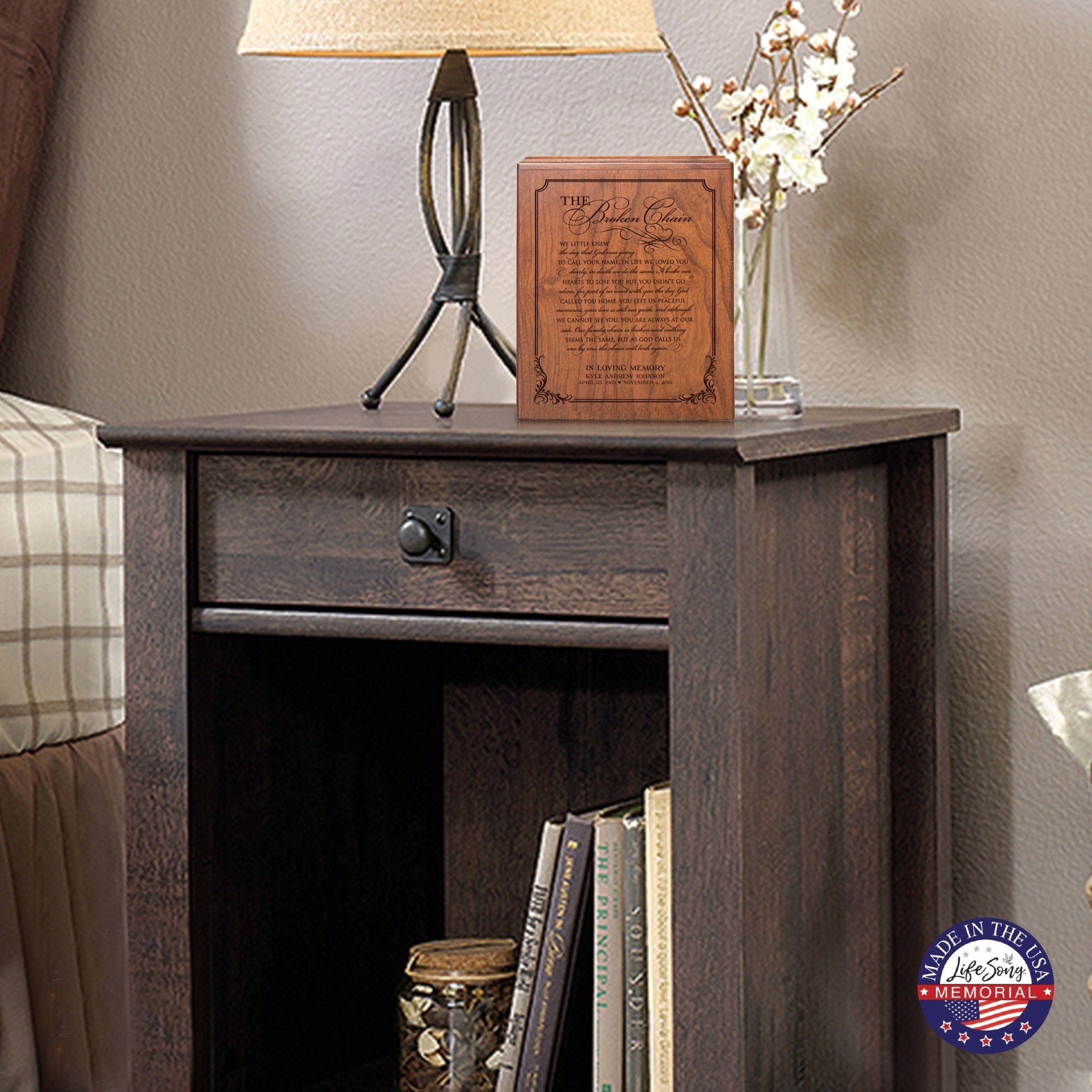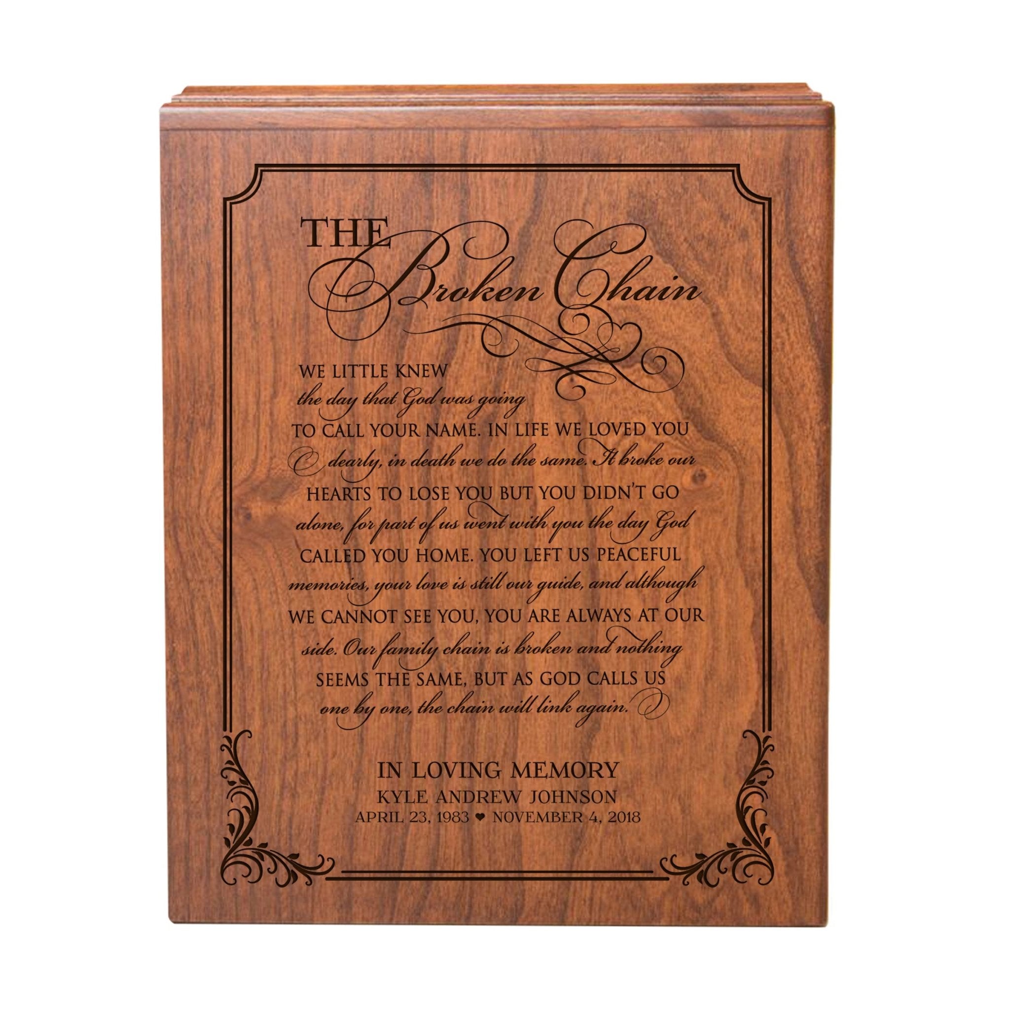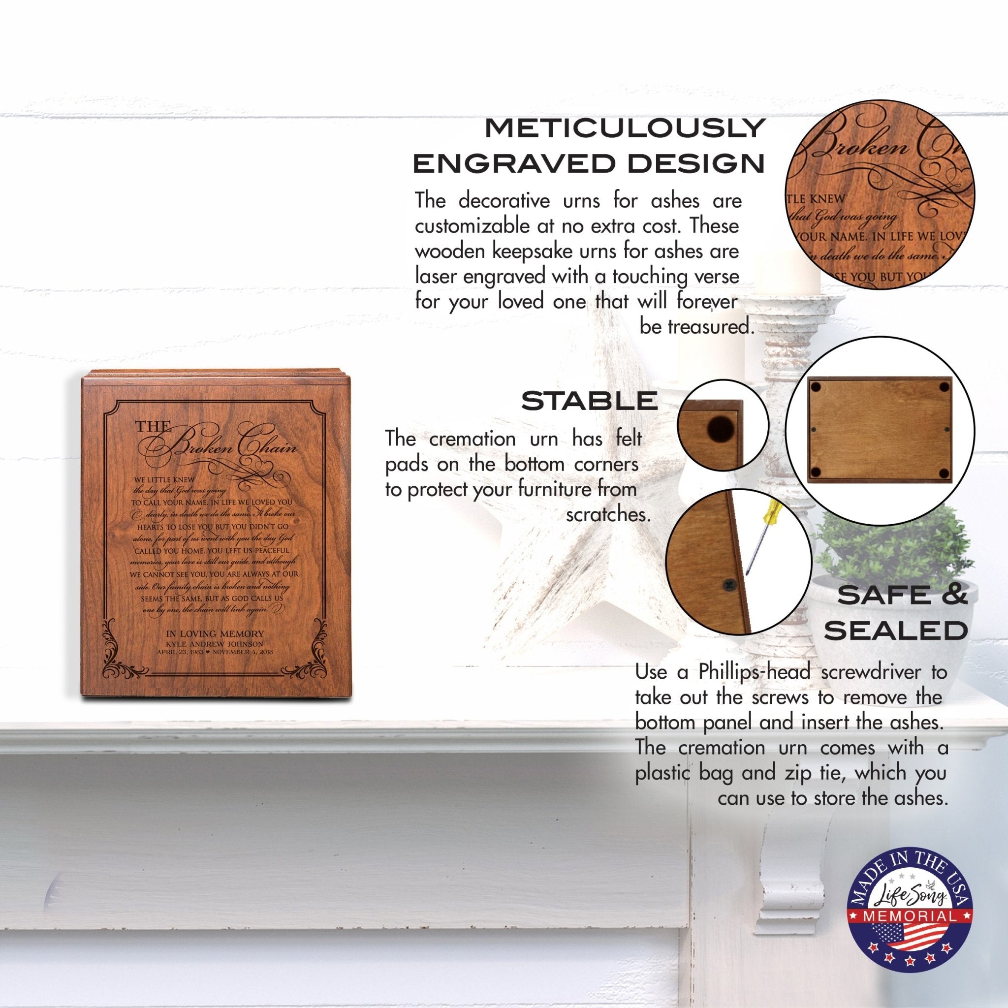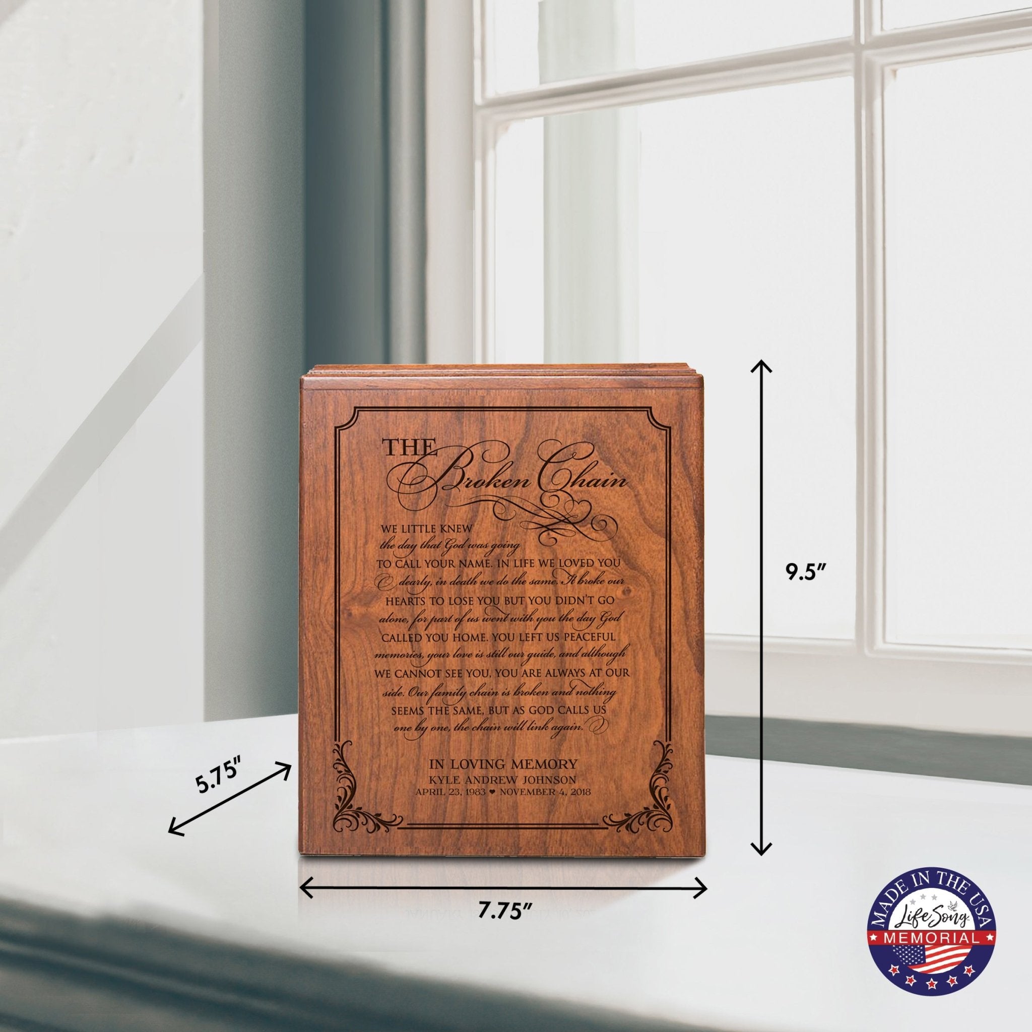 Introducing our exquisite Personalized Memorial Horizontal & Economy Cremation Urn For Adult Ashes - The Broken Chain. Meticulously crafted to honor the lives of your loved ones, this urn is a true testament to their memory. Designed for adult males and females, it provides a dignified resting place for their ashes. Constructed with utmost durability, it ensures the preservation of their precious remains for generations to come.