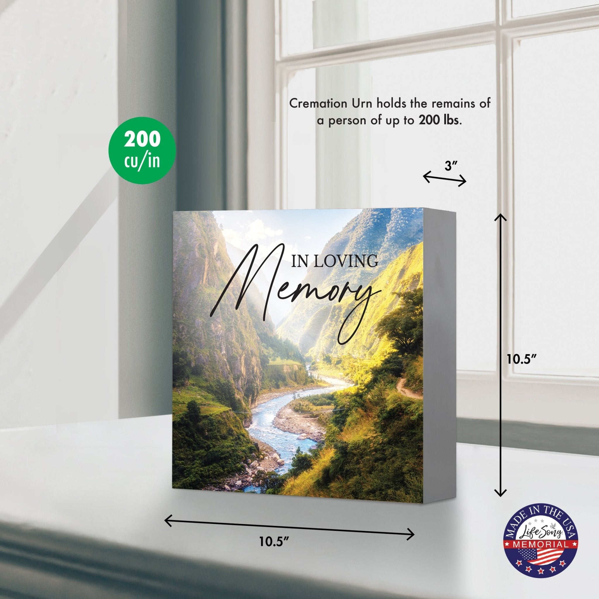 | 10.5” (W) x 10.5” (H) x 3” (L) | Holds 200 cu. in. of human ashes | 1 lb 10 oz |