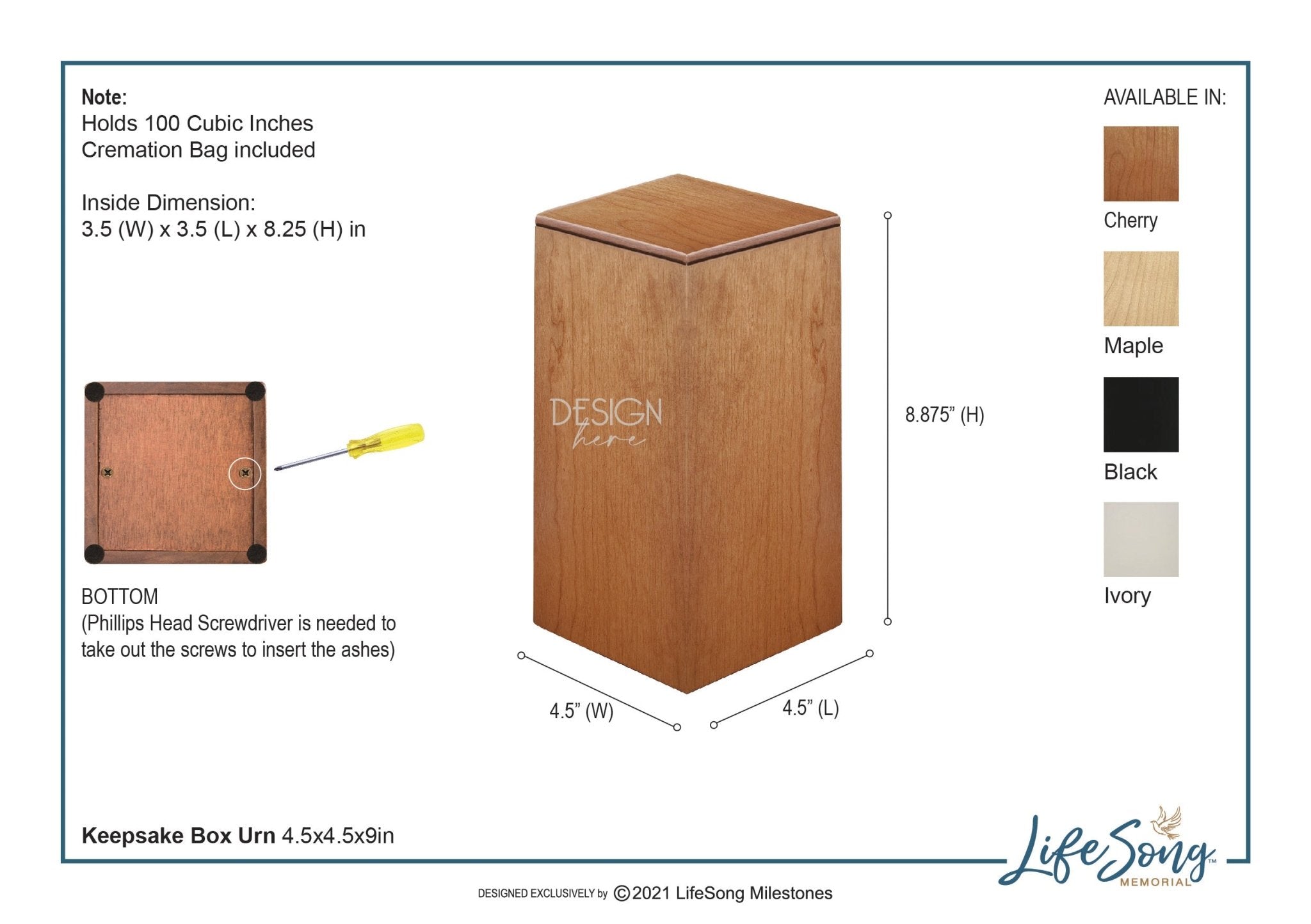 • Volume Capacity: 100 cu. in. of ashes also equivalent to 100 lbs body weight of a pet at the time of passing