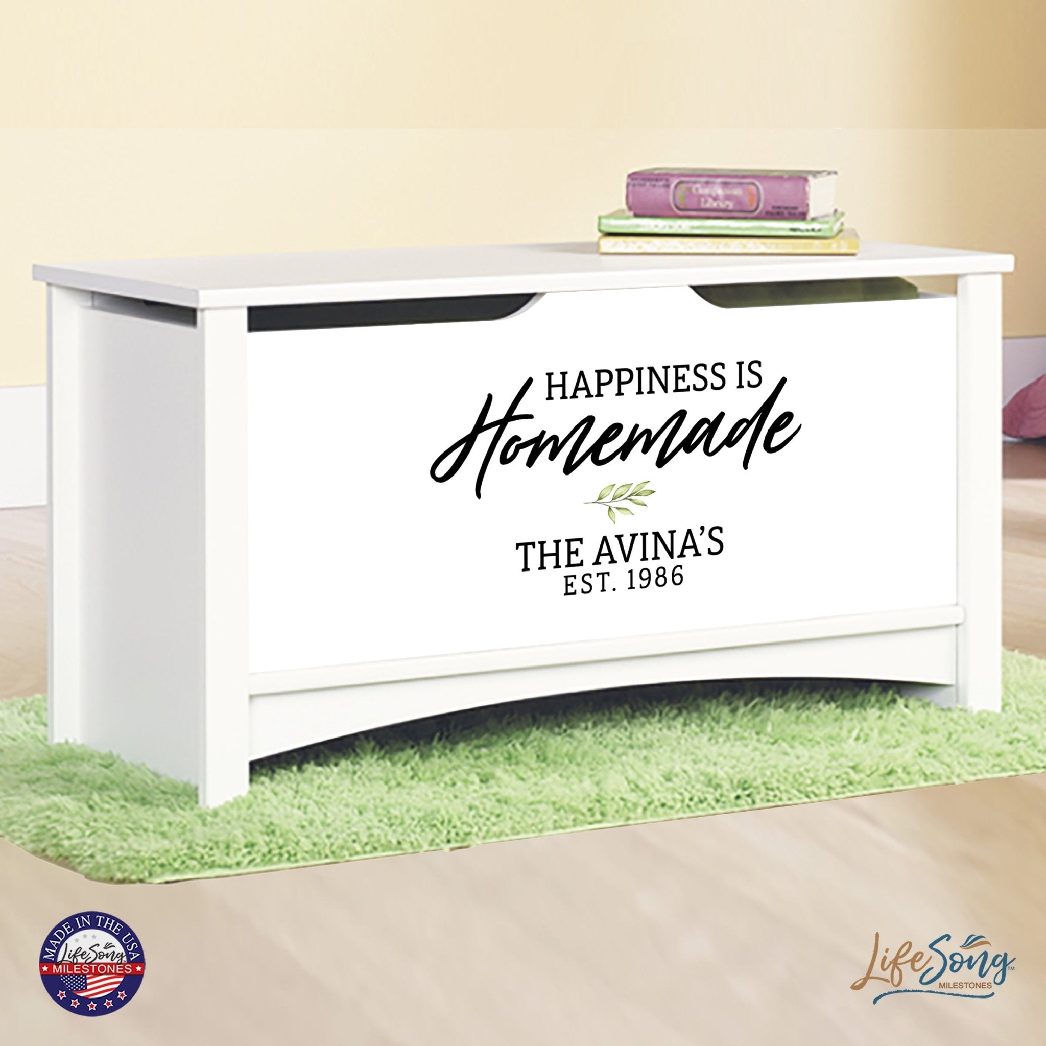 Keep toys, books, blankets, and keepsakes organized with our personalized wooden toy storage chest. Designed with two safety support hinges, the lid stays open to protect little fingers. A front handle slot ensures easy, pinch-free access. Crafted in the USA from durable engineered wood, this toy box with lid features smooth surfaces that are easy to clean. Its simple, timeless design blends perfectly with any nursery, bedroom, or living room decor. Use it as a toy chest, blanket box, or keepsake trunk—this versatile piece is perfect for family organization and heirloom storage.
